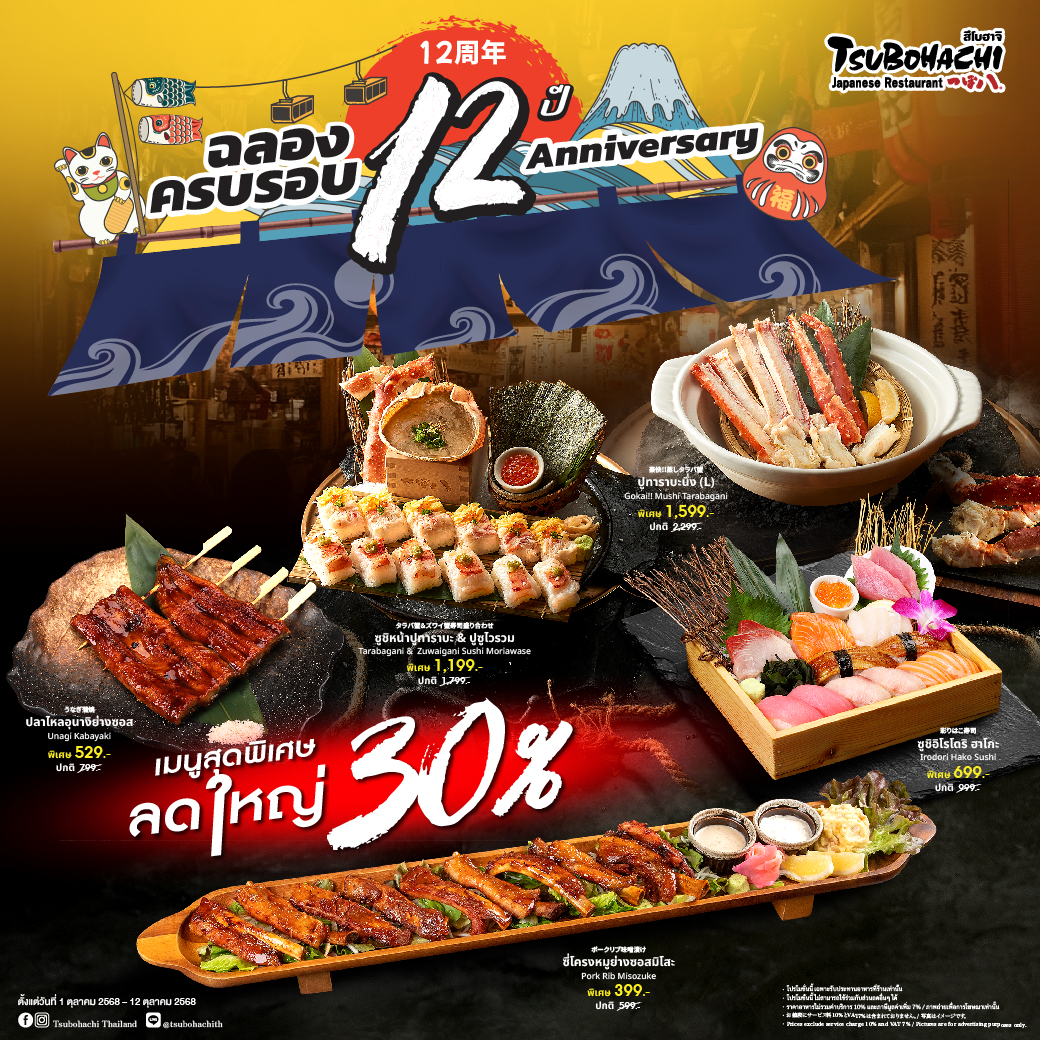 ร้านอาหารญี่ปุ่น “สึโบฮาจิ” ฉลองครบรอบ 12 ปี จัดเต็ม 12 วันแห่งความอร่อย ขอมอบโปรโมชั่นพิเศษลดราคาสูงสุด 30% สำหรับ 5 เมนูยอดนิยมและเมนูสุดพิเศษเอาใจคุณ อาทิ “ปูทาราบะนึ่ง” (ไซส์ใหญ่) คัดความสดปูทาราบะตัวโตจากฮอกไกโด นึ่งเพียง 5 นาที ราคาเพียง 1,599 บาท, “ซูชิหน้าปูทาราบะ & ปูซูไวรวม” รวมเมนูซูชิสุดพรีเมียม เนื้อปูทาราบะและปูซูไว แบบอัดแน่น เสิร์ฟพร้อมคานิมิโสะมันปูแสนอร่อย ราคาเพียง 1,199 บาท,เมนูใหม่สุดพิเศษ “ซูชิอิโรโดริ ฮาโกะ” ซาชิมิและซูชิมิชั้นเลิศ อัดแน่นเต็มกระบะ ราคาเพียง 699 บาท และขอแนะนำ “ซี่โครงหมูย่างซอสมิโสะ” ซี่โครงหมูหมักซอสมิโสะแบบข้ามคืน ย่างจนหอมเสิร์ฟพร้อมสลัดและมันบดสไตล์ญี่ปุ่น ราคาเพียง 399 บาท และ “ปลาไหลอุนางิย่างซอส” ปลาไหลอุนางิย่างหอมๆ ราคาเพียง 529 บาท