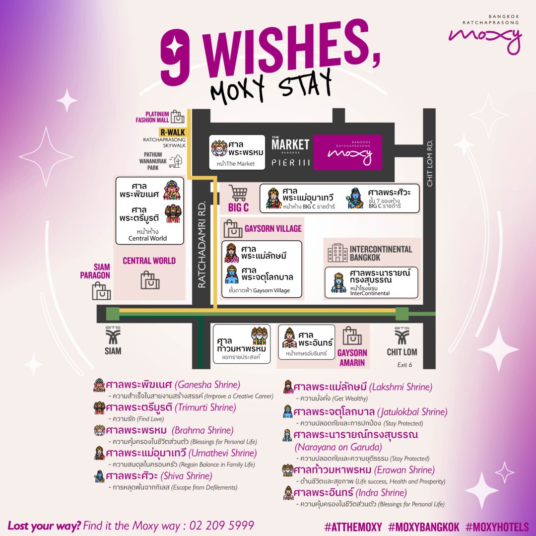 แพ็กเกจ “9 Wishes, Moxy Stay” นี้ชวนแขกออกเดินทางตามรอย เส้นทางไหว้ขอพร 9 สถานที่ศักดิ์สิทธิ์ในกรุงเทพฯ ซึ่งสามารถเริ่มได้จากโรงแรมโดยตรง เส้นทางสายมูยอดนิยมนี้เชื่อกันว่าจะนำพาความโชคดี ความสำเร็จ และสิริมงคลตลอดปี เหมาะสำหรับนักเดินทางที่ต้องการต้อนรับปีใหม่ด้วยแรงบันดาลใจและพลังบวก
