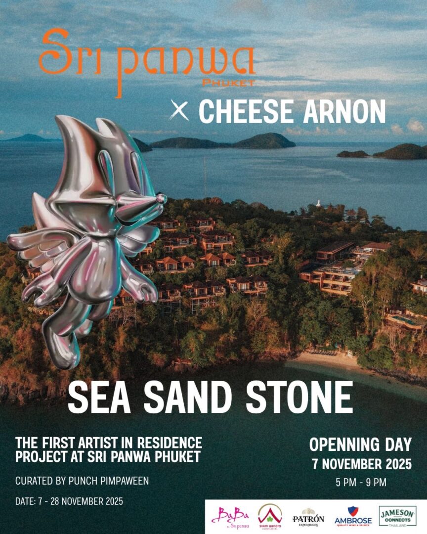 นิทรรศการ “Sea Sand Stone” เป็นส่วนหนึ่งของโครงการศิลปินในพำนัก (Artist in Residence) ครั้งแรกของศรีพันวา ภูเก็ต ซึ่งเป็นความร่วมมือระหว่างศรีพันวา รีสอร์ทหรูระดับไฮเอนด์ที่ให้ความสำคัญกับศิลปะและความคิดสร้างสรรค์